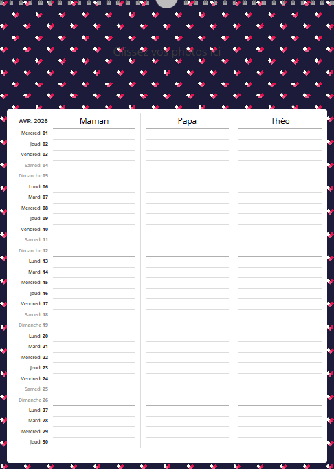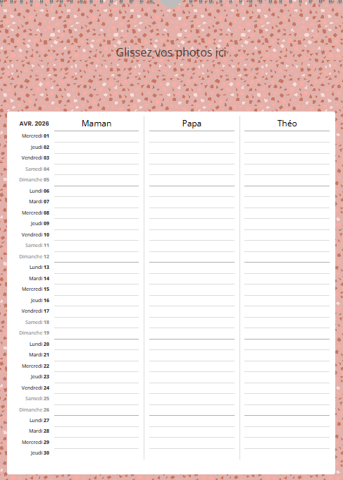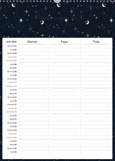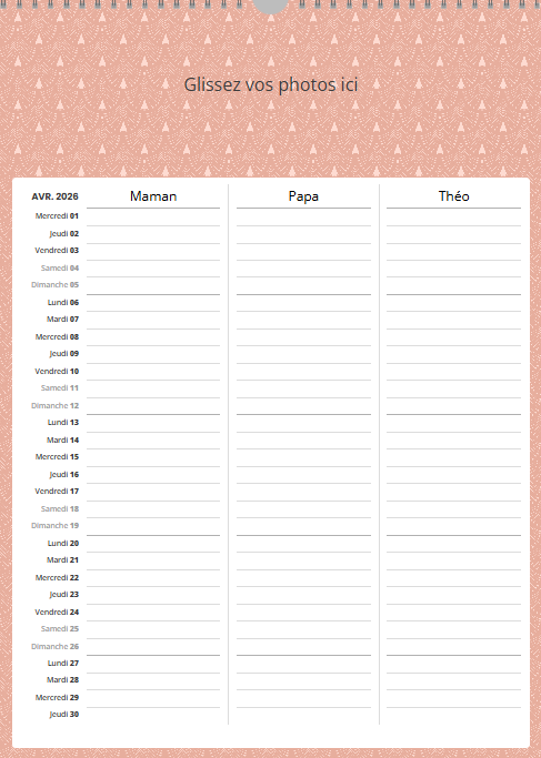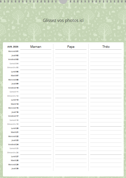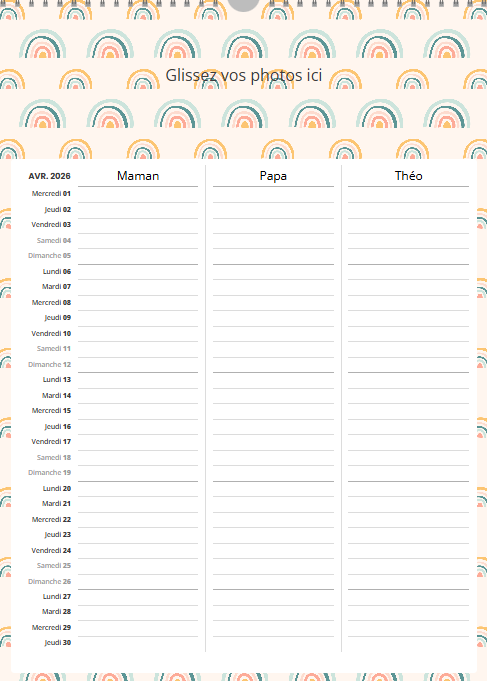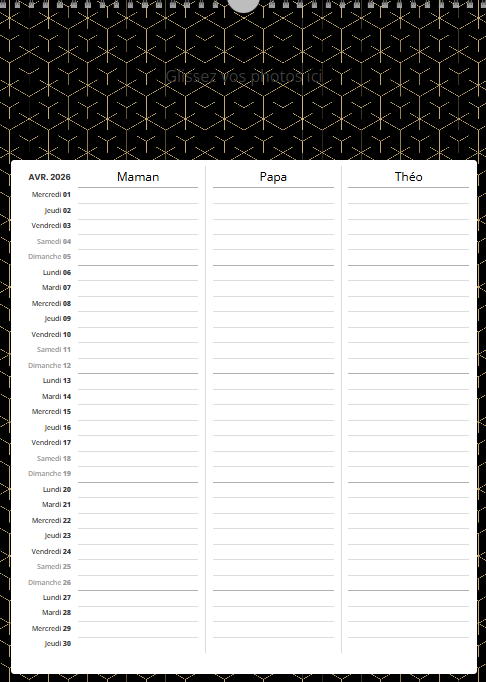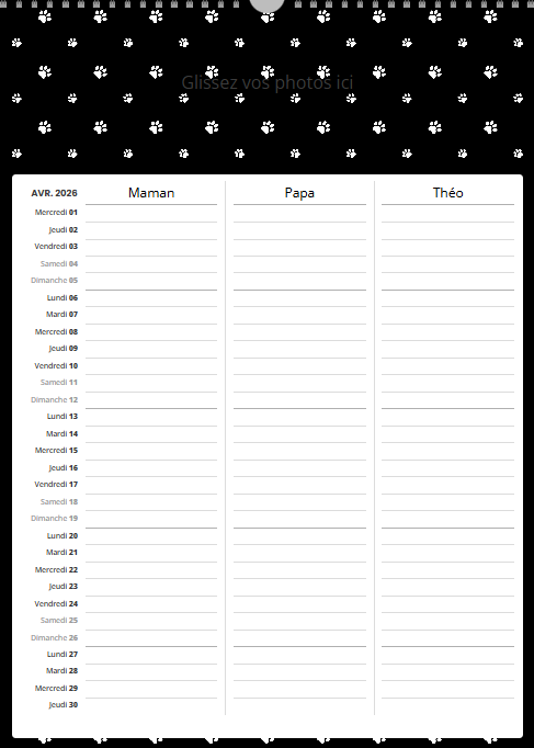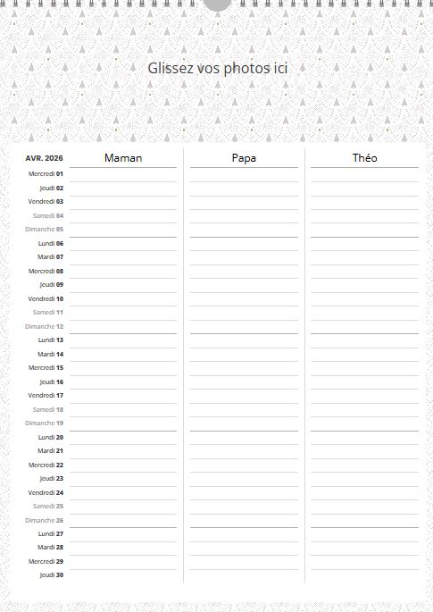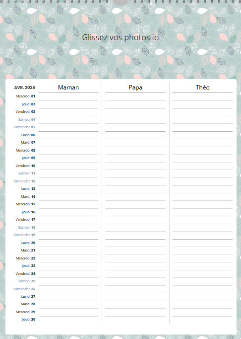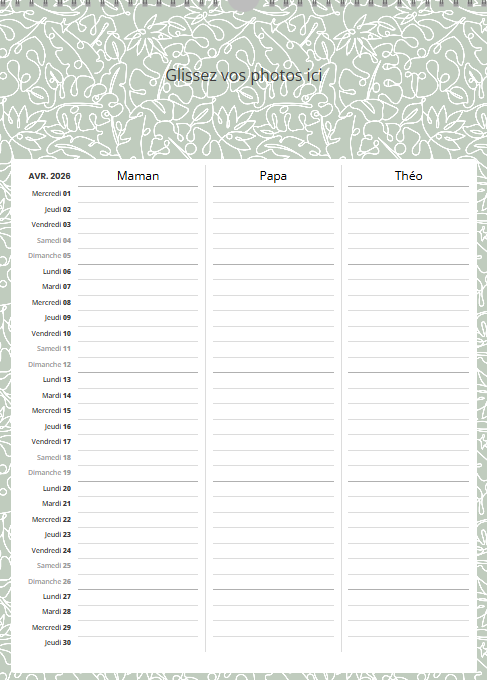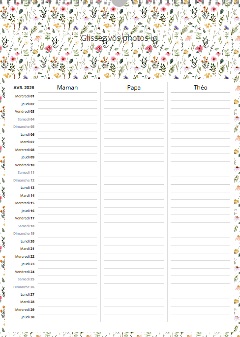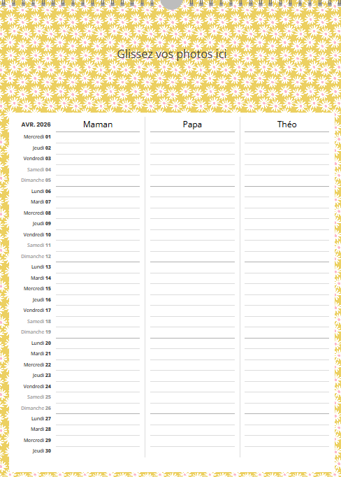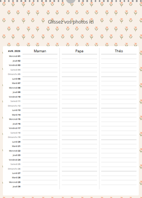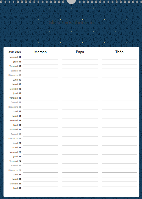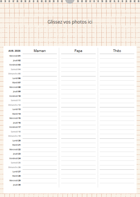 Ce calendrier personnalisé mural A3 portrait (30 x 42 cm) avec grille famille n’est pas uniquement un support photo : c’est un agenda familial collaboratif qui simplifie la vie.