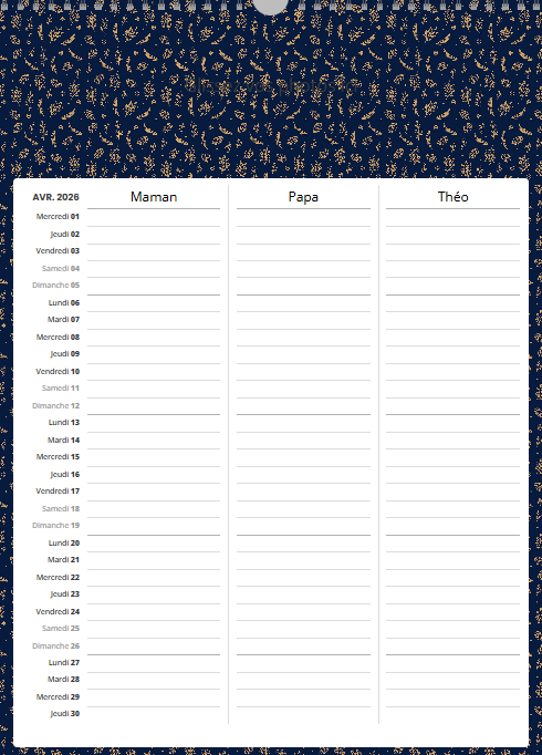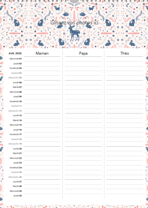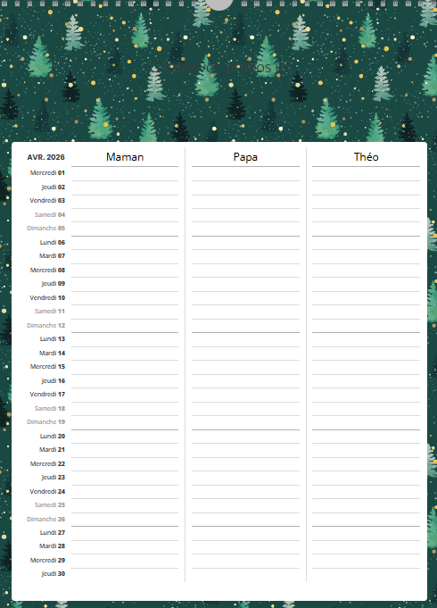 Bonne nouvelle : voici le calendrier idéal pour garder l’esprit tranquille et organiser toute la vie de famille. Une page par mois, une colonne pour chaque membre de la famille, des fonds de page à choisir pour créer un calendrier à l’image de votre tribu — simple, pratique, et unique.