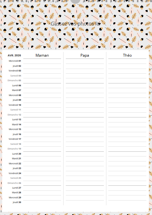 • Photos personnalisables par mois : photos de famille, voyages, instants précieux avec un rendu décoratif.