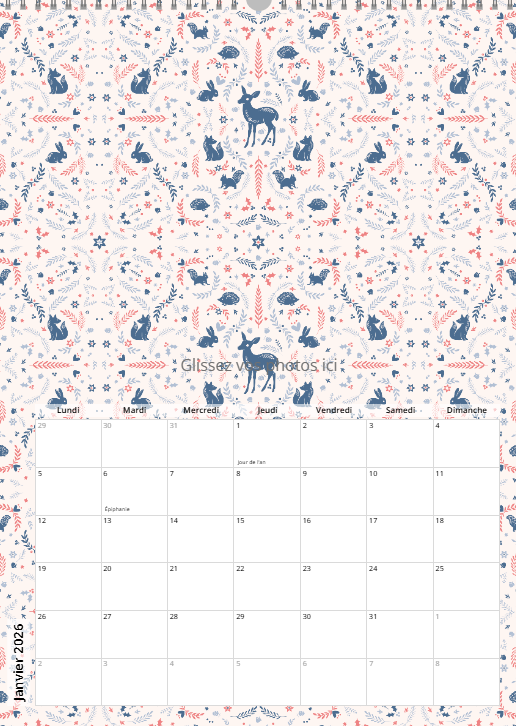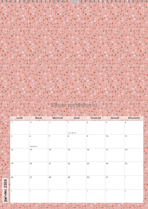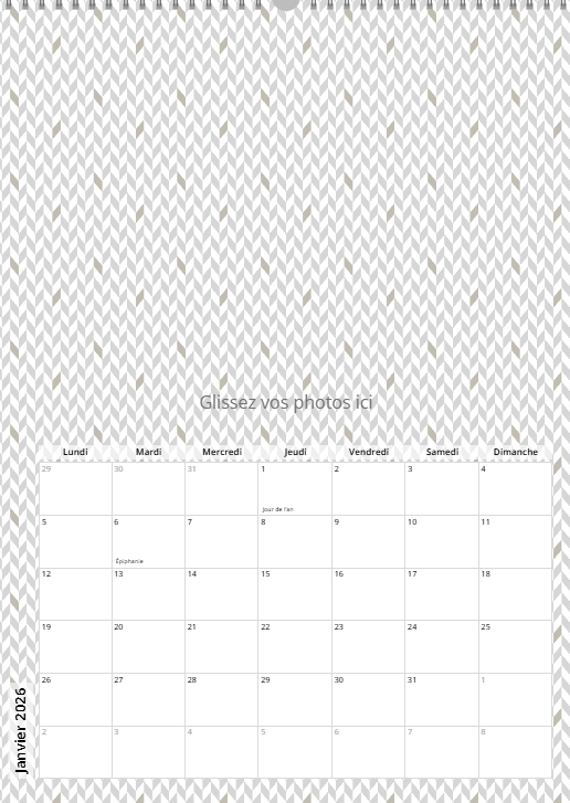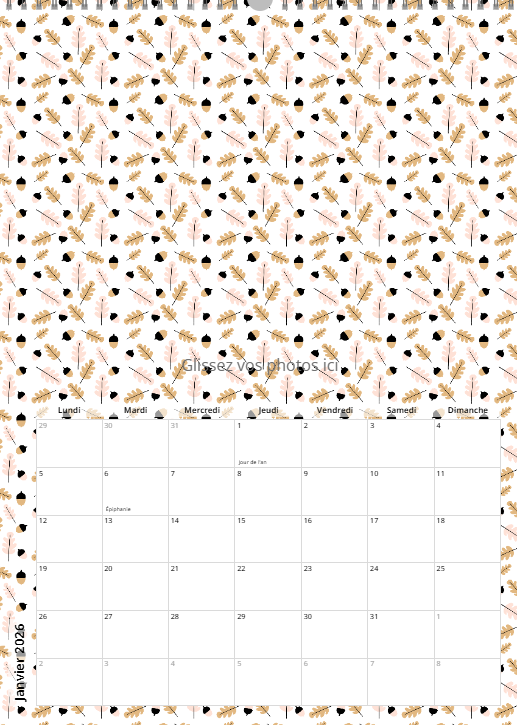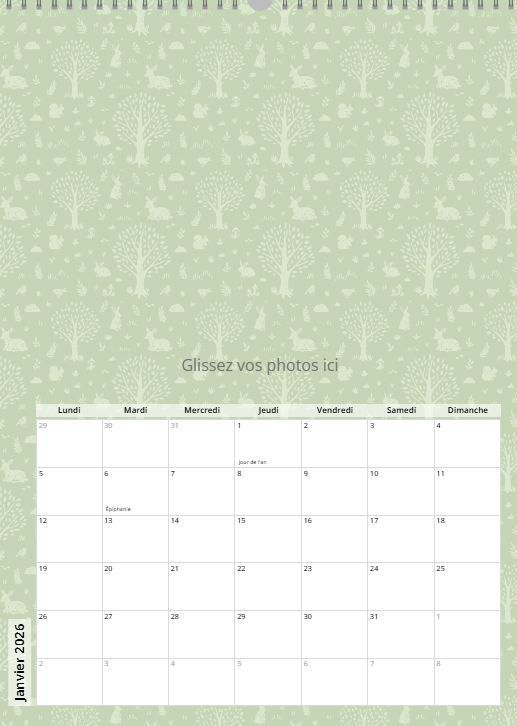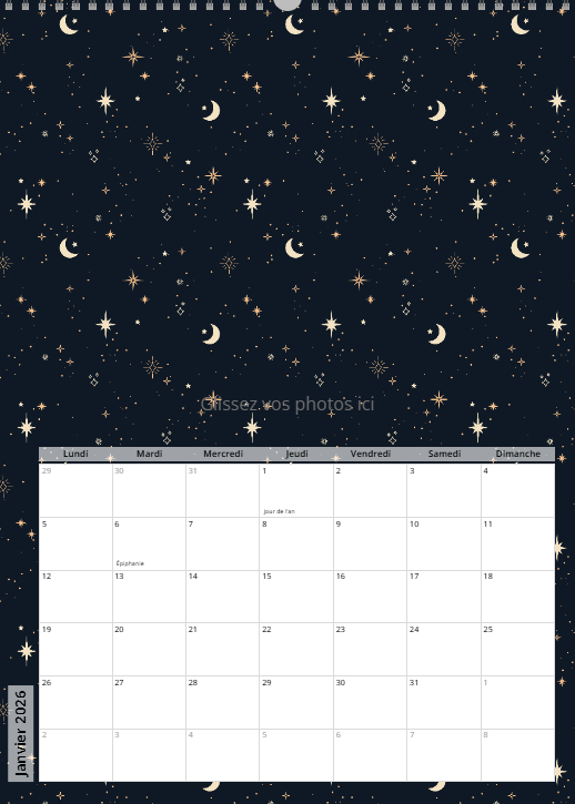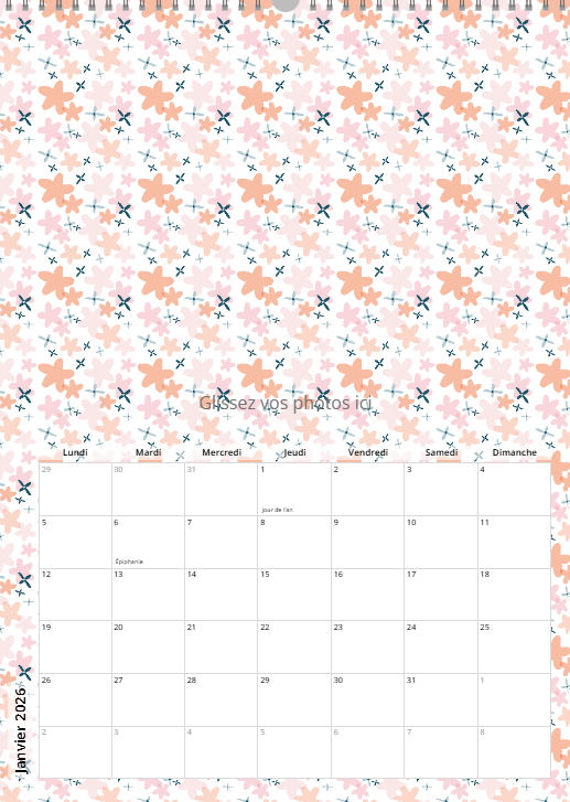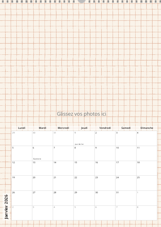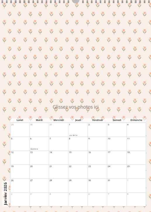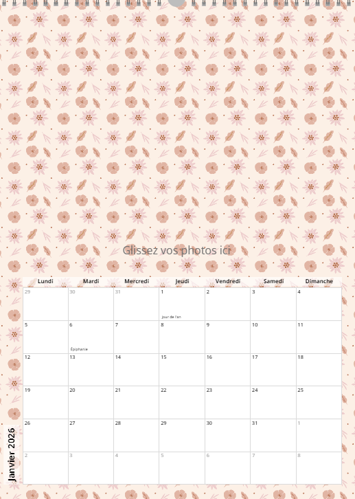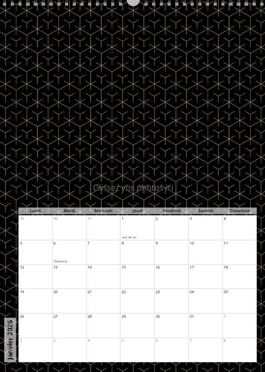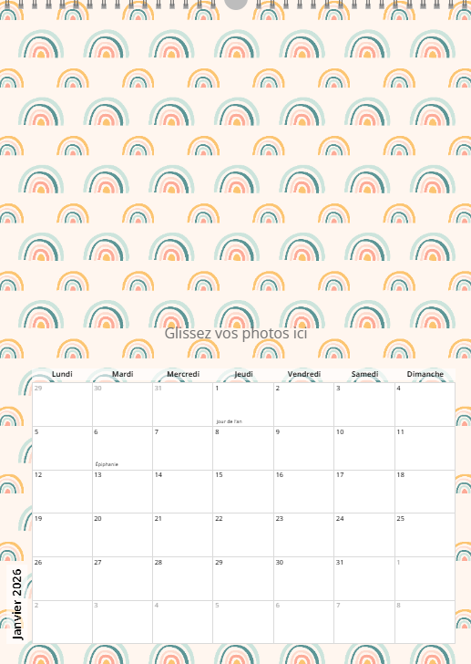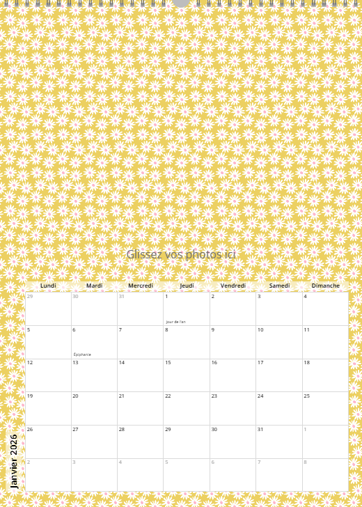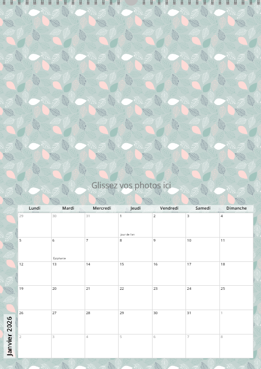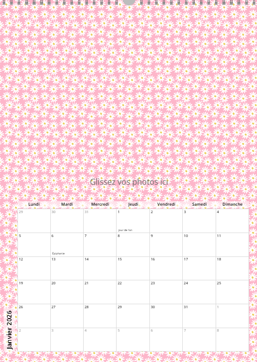 Avec son format géant, ce calendrier ne passera pas inaperçu dans votre maison… Il vous suffira de glisser toutes vos plus belles photos de famille, voyages, festivités au fil des mois pour que vos proches vous accompagnent tout au long de l’année. Vous pouvez également personnaliser les cases des jours en ajoutant des photos sur les dates de votre choix. Plus d’excuses pour oublier les anniversaires ! Il sera pour vous un véritable élément de déco qui vous permettra de vous rappeler de toutes les dates importantes de l’année à venir.